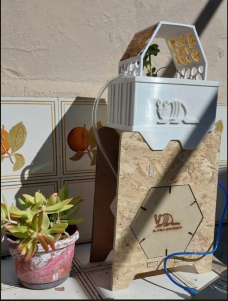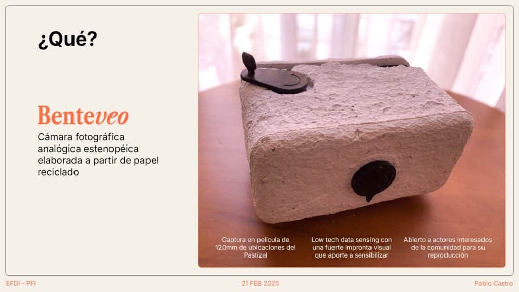 Benteveo (Estudiante: Pablo Castro): Una cámara fotográfica analógica estenopeica elaborada a partir de papel reciclado. Diseñada para capturar en película de 120mm, busca sensibilizar a través de una fuerte impronta visual y está abierta a la comunidad para su reproducción. Es completamente documentable, reparable, reciclable y adaptable, utilizando procesos aditivos y sustractivos con materiales como PLA, papel reciclado y aluminio recuperado.