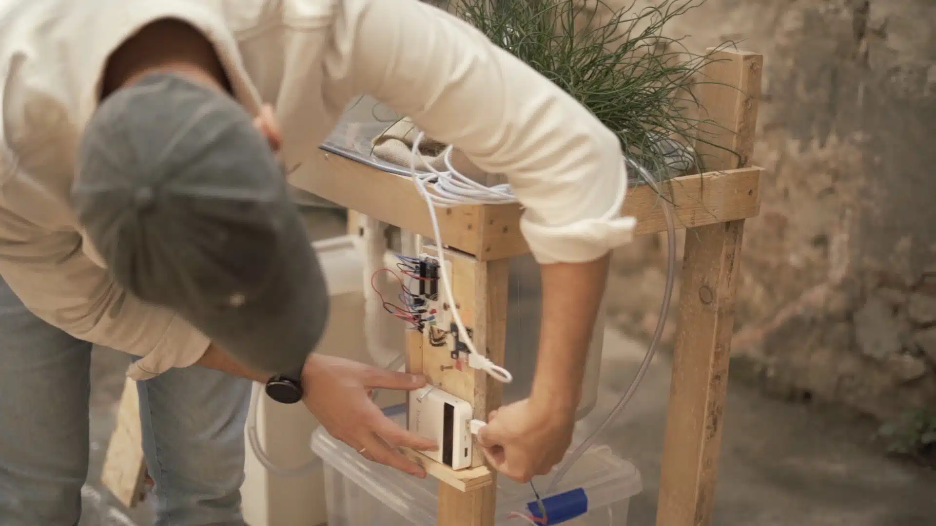 The plants, ceramic pieces, sand and activated carbon filters integrated in the prototype clean the water after each use and circulate it back to its users in an intentionally semi-automated workflow.